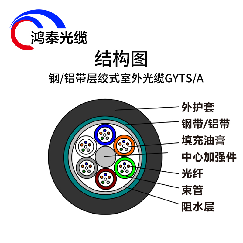 GYTS光缆的结构是将250um光纤套入高模量材料制成的松套管中,松套管内填充防水化合物。 缆芯的中心是一根金属加强芯,对于某些芯数的光缆来说,金属加强芯外还需挤上一层聚乙烯(PE)。松套管和填充绳围绕中心加强芯绞合成紧凑和圆形的缆芯,缆芯内的缝隙充以阻水填充物。双面涂塑钢带(PSP)纵包后挤制聚乙烯护套成缆。