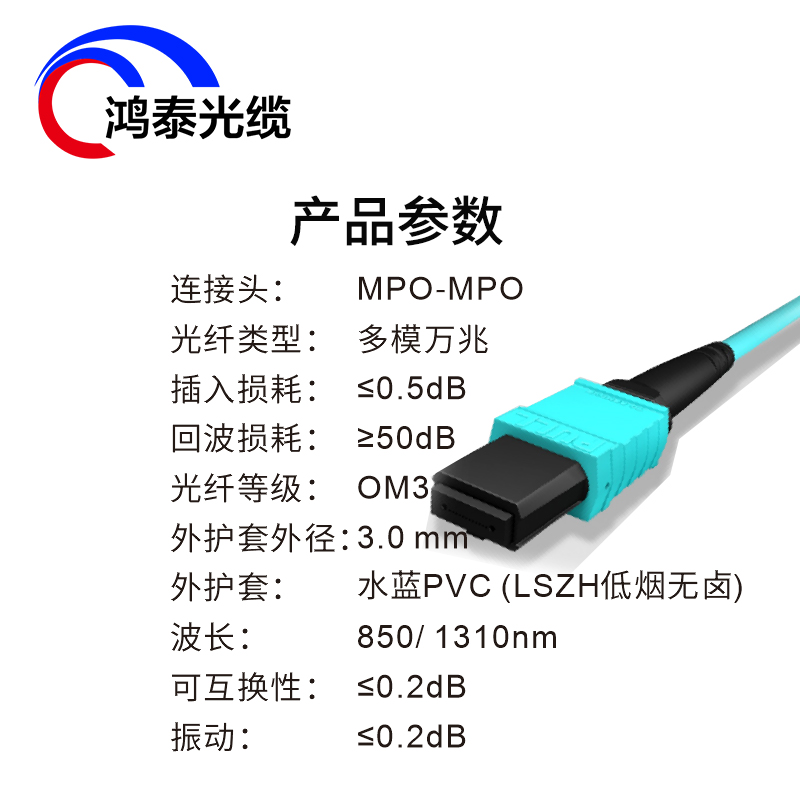 连接头:MPO-MPO光纤类型:多模万兆插入损耗:≤0.5dB回波损耗:250dB光纤等级:OM3外护套外径:3.0 mm外护套:水蓝PVC (LSZH低烟无卤)波长:850/1310nm可互换性:≤0.2dB振动:≤0.2dB